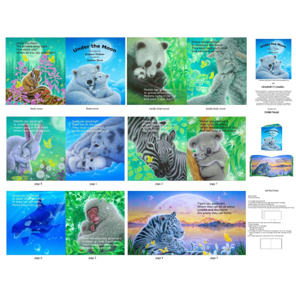 New. Fabric Book Panel. This book panel shows adorable little animals and how they say goodnight. "Koalas say goodnight High up in the Trees. Where they are safe and cozy And can sway in the breeze." "Tigers say goodnight Where they can be all alone. Jungles and mountains Are where they call home." Adorable book your child will love! Fabric by Kentaro Nishino for Elizabeths Studio. (2025) Cotton Fabric. 35"x44", pages aprox 8 1/2"x8 1/2"