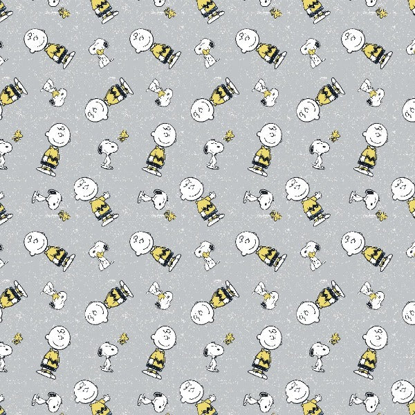 End of Bolt Remnant. Width 44". Length 18" plus. Snoopy and Charlie Brown Fabric to sew. This print shows silly images of Snoopy and Charlie Brown tossed on a grey background. Fabric by Peanuts Worldwide for Springs Creative. Cotton Fabric. (2019)